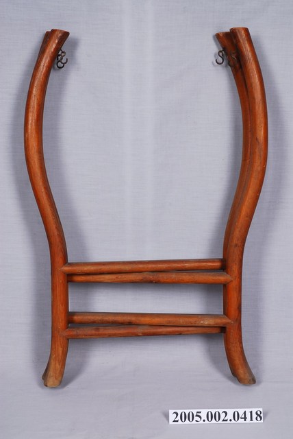 本件為鼓架,木頭製作,四柱頂端的內側鑽上金屬圓鈎,鼓身中間也有鼓環,兩者可以紅繩互綁,使鼓懸掛在鼓架中,方便鼓棒敲擊發聲。