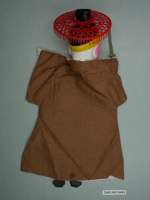 本件保存良好,為布袋戲角色藏鏡人戲偶,偶之特徵為粉色腮紅、紅色帽子及手上持劍,服裝正面為粉色花紋,背面為棕色。