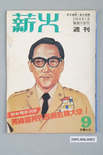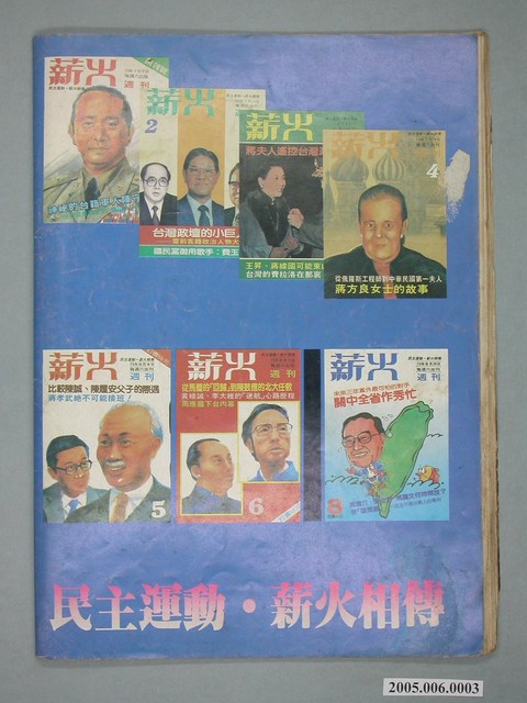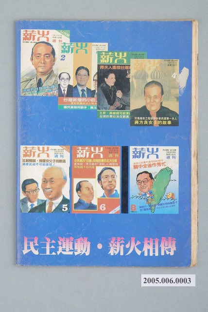 此物件為1984年7月創辦的《薪火》週刊,此雜誌由耿榮水發行以及由黃森松擔任編輯,此雜誌為批判國民黨並為黨外勢力宣傳的黨外雜誌,並在創刊號表明此雜誌「民主運動,薪火相傳」的主旨。而此雜誌的發行人耿榮水為臺灣資深政論家,並著有《黨外人士何去何從》一書,曾擔任《仙人掌》雜誌、《綜合月刊》的編輯。而黃森松為美濃地方誌《今日美濃》的創辦人,後因曾發表政治相關的評論而遭停刊,因而轉為協助《深耕》創辦黨外週刊,也擔任過《蓬萊島》雜誌的編輯,現今則持續經營《今日美濃》雜誌,為故鄉盡心盡力。 「黨外」一詞主要為非中國國民黨的臺灣政治勢力,而「黨外」政治勢力,主要的宣傳方式為「黨外雜誌」,「黨外雜誌」最早如1950年代的《自由中國》、1970年代的《大學》、《臺灣政論》,後在1980年代「黨外雜誌」發展蓬勃,代表刊物為《八十年代》與《美麗島》,最終,這股媒體趨勢在1986年民進黨成立、1987年解除戒嚴之後逐漸式微。「黨外雜誌」在當時激起了臺灣民眾的民主意識,也逐步促成了言論自由開放。(蕭淑玲,2006,153-155)。