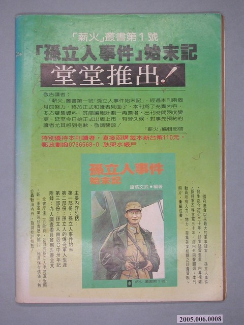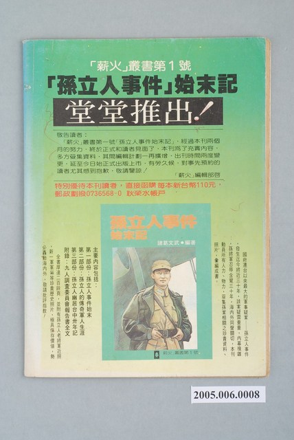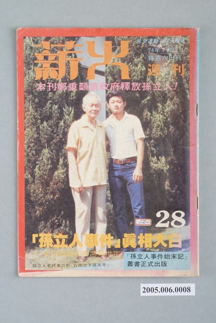 此物件為1984年7月創辦的《薪火》週刊,此雜誌由耿榮水發行以及由黃森松擔任編輯,此雜誌為批判國民黨並為黨外勢力宣傳的黨外雜誌,並在創刊號表明此雜誌「民主運動,薪火相傳」的主旨。而此雜誌的發行人耿榮水為臺灣資深政論家,並著有《黨外人士何去何從》一書,曾擔任《仙人掌》雜誌、《綜合月刊》的編輯。而黃森松為美濃地方誌《今日美濃》的創辦人,後因曾發表政治相關的評論而遭停刊,因而轉為協助《深耕》創辦黨外週刊,也擔任過《蓬萊島》雜誌的編輯,現今則持續經營《今日美濃》雜誌,為故鄉盡心盡力。 「黨外」一詞主要為非中國國民黨的臺灣政治勢力,而「黨外」政治勢力,主要的宣傳方式為「黨外雜誌」,「黨外雜誌」最早如1950年代的《自由中國》、1970年代的《大學》、《臺灣政論》,後在1980年代「黨外雜誌」發展蓬勃,代表刊物為《八十年代》與《美麗島》,最終,這股媒體趨勢在1986年民進黨成立、1987年解除戒嚴之後逐漸式微。「黨外雜誌」在當時激起了臺灣民眾的民主意識,也逐步促成了言論自由開放。(蕭淑玲,2006,153-155)。
