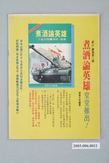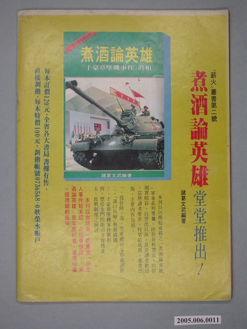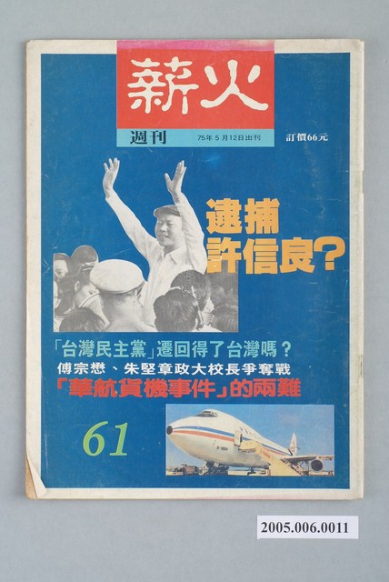 此物件為1984年7月創辦的《薪火》週刊,此雜誌由耿榮水發行以及由黃森松擔任編輯,此雜誌為批判國民黨並為黨外勢力宣傳的黨外雜誌,並在創刊號表明此雜誌「民主運動,薪火相傳」的主旨。而此雜誌的發行人耿榮水為臺灣資深政論家,並著有《黨外人士何去何從》一書,曾擔任《仙人掌》雜誌、《綜合月刊》的編輯。而黃森松為美濃地方誌《今日美濃》的創辦人,後因曾發表政治相關的評論而遭停刊,因而轉為協助《深耕》創辦黨外週刊,也擔任過《蓬萊島》雜誌的編輯,現今則持續經營《今日美濃》雜誌,為故鄉盡心盡力。 「黨外」一詞主要為非中國國民黨的臺灣政治勢力,而「黨外」政治勢力,主要的宣傳方式為「黨外雜誌」,「黨外雜誌」最早如1950年代的《自由中國》、1970年代的《大學》、《臺灣政論》,後在1980年代「黨外雜誌」發展蓬勃,代表刊物為《八十年代》與《美麗島》,最終,這股媒體趨勢在1986年民進黨成立、1987年解除戒嚴之後逐漸式微。「黨外雜誌」在當時激起了臺灣民眾的民主意識,也逐步促成了言論自由開放。(蕭淑玲,2006,153-155)。