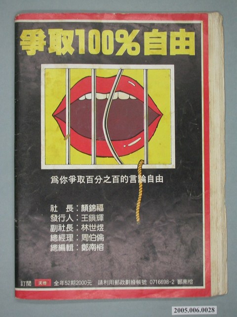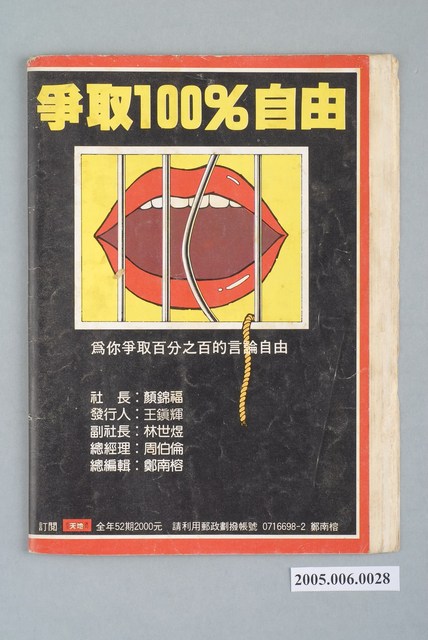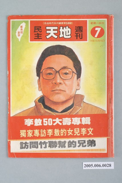 此為自由時代雜誌社1985年4月15日出版的《民主天地》週刊第7期總號第58號,內容計有〈你不可殺人!──「生命權」是第一人權〉(鄭南榕)、〈我的爸爸李敖,獨家越洋訪問:李敖的女兒李文〉、〈「陪他走一段」──劉會雲眼中的李敖〉(林歡)、〈歡送政論家,歡迎思想家──李敖辭卸本刊總監感言〉(鄭南榕)、〈「國民黨犯了江湖大忌,我們會記住這筆帳的!」──訪問竹聯幫兄弟〉、〈汪希苓也只揹『道德責任』〉(江楓)、〈「使受壓迫的人得自由,得見天日」──高俊明連任長老教會總幹事〉(林淑如)、〈判決書後面,那隻看不見的手〉(葉向芝)、〈究竟陳啟禮的殺人動機是什麼?──江鵬堅分析江南命案初審判決〉、〈蔣孝武的立法院代言人〉、〈徐立德重新上班〉、〈楊金欉病情危殆〉等。 此物件為鄭南榕所創辦的《自由時代》系列雜誌之一。由於意識到出版審查之嚴峻,鄭南榕在刊物創辦之初便註冊了為數眾多的「時代」系列標題,以免後續因遭查禁而無法準時出刊,另《自由時代》為保護相關供稿者,鄭南榕主動承擔《自由時代》一切文責,且不在雜誌目錄頁著錄個別作者姓名。《自由時代》標榜著「爭取百分之百的言論自由」,致力於追蹤黨國內幕、打破禁忌話題,也籌劃街頭社會運動――如「五一九綠色行動」。《自由時代》訴求黨外組黨,在民主進步黨成立後則主張群眾路線,對於較保守的公職路線則加以批判。 「黨外」一詞主要為非中國國民黨的臺灣政治勢力,而「黨外」政治勢力,主要的宣傳方式為「黨外雜誌」,「黨外雜誌」最早如1950年代的《自由中國》、1970年代的《大學》、《臺灣政論》,後在1980年代「黨外雜誌」發展蓬勃,代表刊物為《八十年代》與《美麗島》,最終,這股媒體趨勢在1986年民進黨成立、1987年解除戒嚴之後逐漸式微。「黨外雜誌」在當時激起了臺灣民眾的民主意識,也逐步促成了言論自由開放。(蕭淑玲,2006,153-155)。