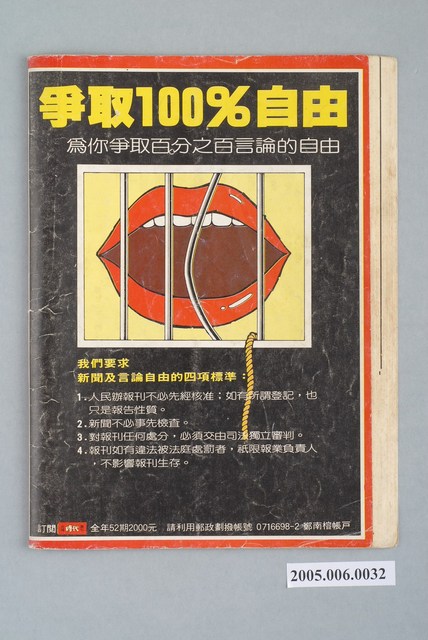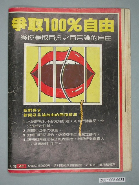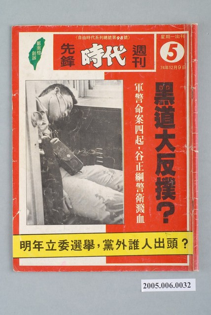 此為自由時代雜誌社1985年12月9日出版的《先鋒時代》週刊第5期總號98號,內容計有〈做工的喝風,作案的輕鬆──新玻員工示威記實〉(葉向芝)、〈黑道大反撲?──掃黑行動越掃越黑〉(莊守義)、〈顧正秋、蔣經國、任顯群的三角習題〉、〈阿扁要抓真兇──吳淑珍「車禍」案開庭記〉(徐曼青)、〈汪敬煦為什麼下台?〉(江楓)、〈宋楚瑜的笑料〉(賀薇)、〈明年立委選擧,黨外誰人出頭?〉、〈自決與台灣前途──戰後國際社會對台灣自決的態度與做法〉(林濁水)、〈再見,艾奎諾!──馬可仕擺平「艾奎諾案」的高招〉等。 此物件為鄭南榕所創辦的《自由時代》系列雜誌之一。由於意識到出版審查之嚴峻,鄭南榕在刊物創辦之初便註冊了為數眾多的「時代」系列標題,以免後續因遭查禁而無法準時出刊,另《自由時代》為保護相關供稿者,鄭南榕主動承擔《自由時代》一切文責,且不在雜誌目錄頁著錄個別作者姓名。《自由時代》標榜著「爭取百分之百的言論自由」,致力於追蹤黨國內幕、打破禁忌話題,也籌劃街頭社會運動――如「五一九綠色行動」。《自由時代》訴求黨外組黨,在民主進步黨成立後則主張群眾路線,對於較保守的公職路線則加以批判。 「黨外」一詞主要為非中國國民黨的臺灣政治勢力,而「黨外」政治勢力,主要的宣傳方式為「黨外雜誌」,「黨外雜誌」最早如1950年代的《自由中國》、1970年代的《大學》、《臺灣政論》,後在1980年代「黨外雜誌」發展蓬勃,代表刊物為《八十年代》與《美麗島》,最終,這股媒體趨勢在1986年民進黨成立、1987年解除戒嚴之後逐漸式微。「黨外雜誌」在當時激起了臺灣民眾的民主意識,也逐步促成了言論自由開放。(蕭淑玲,2006,153-155)。