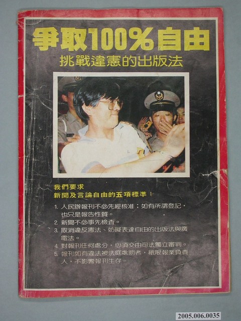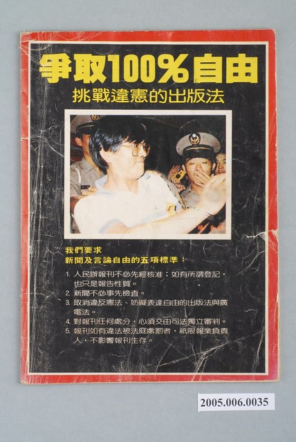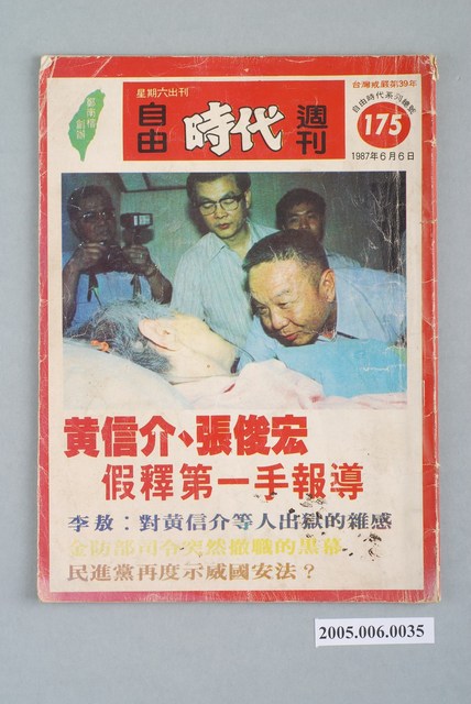此為自由時代雜誌社1987年6月6日出版的《自由時代》週刊總號175號,內容計有〈「赦免」所有政治犯,結束美麗島事件〉(鄭南榕)、〈龍頭老大黃信介出獄訪問記〉、〈我隨時準備再度入獄-訪傳奇人士顏明聖〉、〈吳泰安、余素貞與余登發-一齣可悲的政治鬧劇〉、〈民主之路是無可逃避的-訪張俊宏〉、〈我們有權利叫國民黨滾下去-訪21年坐牢家黃華〉、〈台大「自由之愛」凱旋日〉(夏芝青)、〈整批交易,預算過關-台北市議會初審年度總預算〉(葉向芝)、〈抗議校方無情、無理、無法的懲戒-為414抗議事件告成大師生書〉、〈對黃信介、張俊宏、魏廷朝出獄的雜感〉(李敖)等。 此物件為鄭南榕所創辦的《自由時代》系列雜誌之一。由於意識到出版審查之嚴峻,鄭南榕在刊物創辦之初便註冊了為數眾多的「時代」系列標題,以免後續因遭查禁而無法準時出刊,另《自由時代》為保護相關供稿者,鄭南榕主動承擔《自由時代》一切文責,且不在雜誌目錄頁著錄個別作者姓名。《自由時代》標榜著「爭取百分之百的言論自由」,致力於追蹤黨國內幕、打破禁忌話題,也籌劃街頭社會運動――如「五一九綠色行動」。《自由時代》訴求黨外組黨,在民主進步黨成立後則主張群眾路線,對於較保守的公職路線則加以批判。 「黨外」一詞主要為非中國國民黨的臺灣政治勢力,而「黨外」政治勢力,主要的宣傳方式為「黨外雜誌」,「黨外雜誌」最早如1950年代的《自由中國》、1970年代的《大學》、《臺灣政論》,後在1980年代「黨外雜誌」發展蓬勃,代表刊物為《八十年代》與《美麗島》,最終,這股媒體趨勢在1986年民進黨成立、1987年解除戒嚴之後逐漸式微。「黨外雜誌」在當時激起了臺灣民眾的民主意識,也逐步促成了言論自由開放。(蕭淑玲,2006,153-155)。