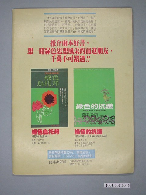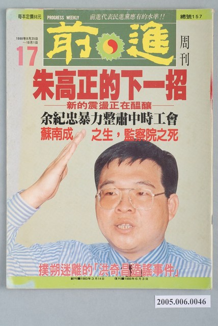 此物件為林正杰創辦的《前進》雜誌系列出版品之一。由於戒嚴期間的出版管制,《前進》面對警總的連番查禁,陸續更改刊名,計有《前進周刊》、《前進廣場》、《前進時代》、《前進世界》等。《前進》之創辦,以「在報禁下尋找更接近真實的客觀報導」為核心理念,其重要創辦人有林正杰、蔡式淵、蔡仁堅,三人皆為民進黨早期派系「前進系」成員。由於認同立場與民進黨在解嚴之後的路線相左,林正杰在1991年民進黨通過「臺獨黨綱」後宣布退黨,其所領導的「前進系」也隨之解散。 「黨外」一詞主要為非中國國民黨的臺灣政治勢力,而「黨外」政治勢力,主要的宣傳方式為「黨外雜誌」,「黨外雜誌」最早如1950年代的《自由中國》、1970年代的《大學》、《臺灣政論》,後在1980年代「黨外雜誌」發展蓬勃,代表刊物為《八十年代》與《美麗島》,最終,這股媒體趨勢在1986年民進黨成立、1987年解除戒嚴之後逐漸式微。「黨外雜誌」在當時激起了臺灣民眾的民主意識,也逐步促成了言論自由開放。(蕭淑玲,2006,153-155)。