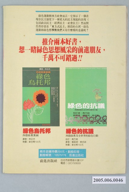 彭琳淞,2007。自由‧民主‧本土‧臺灣――看臺灣戒嚴時期的政論雜誌,全國新書資訊月刊,105:30-40 黨外雜誌,文化部臺灣大百科全書,http://nrch.culture.tw/twpedia.aspx?id=2301(瀏覽日期:2019/05/07)。 前進雜誌社,1983。前進週刊。1,2-3。 蕭淑玲,2006。臺灣黨外雜誌對黨外運動的作用(1979~1986)—以《八十年代》系列、《美麗島》、《蓬萊島》系列兩大路線為例。桃園:中央大學歷史研究所碩士論文。黨外雜誌,文化部臺灣大百