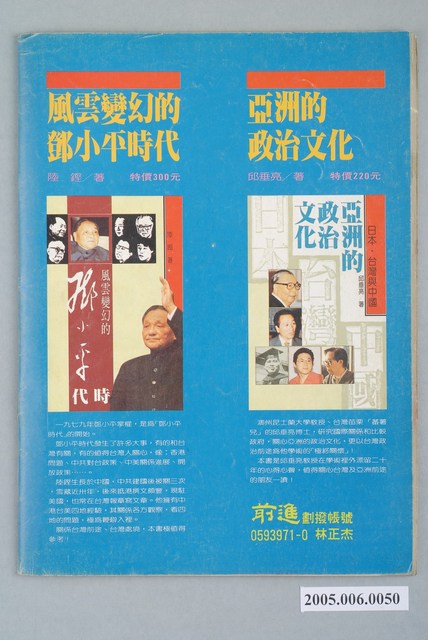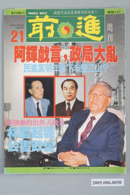 此物件為林正杰創辦的《前進》雜誌系列出版品之一。由於戒嚴期間的出版管制,《前進》面對警總的連番查禁,陸續更改刊名,計有《前進周刊》、《前進廣場》、《前進時代》、《前進世界》等。《前進》之創辦,以「在報禁下尋找更接近真實的客觀報導」為核心理念,其重要創辦人有林正杰、蔡式淵、蔡仁堅,三人皆為民進黨早期派系「前進系」成員。由於認同立場與民進黨在解嚴之後的路線相左,林正杰在1991年民進黨通過「臺獨黨綱」後宣布退黨,其所領導的「前進系」也隨之解散。 「黨外」一詞主要為非中國國民黨的臺灣政治勢力,而「黨外」政治勢力,主要的宣傳方式為「黨外雜誌」,「黨外雜誌」最早如1950年代的《自由中國》、1970年代的《大學》、《臺灣政論》,後在1980年代「黨外雜誌」發展蓬勃,代表刊物為《八十年代》與《美麗島》,最終,這股媒體趨勢在1986年民進黨成立、1987年解除戒嚴之後逐漸式微。「黨外雜誌」在當時激起了臺灣民眾的民主意識,也逐步促成了言論自由開放。(蕭淑玲,2006,153-155)。