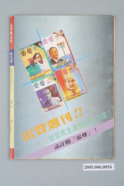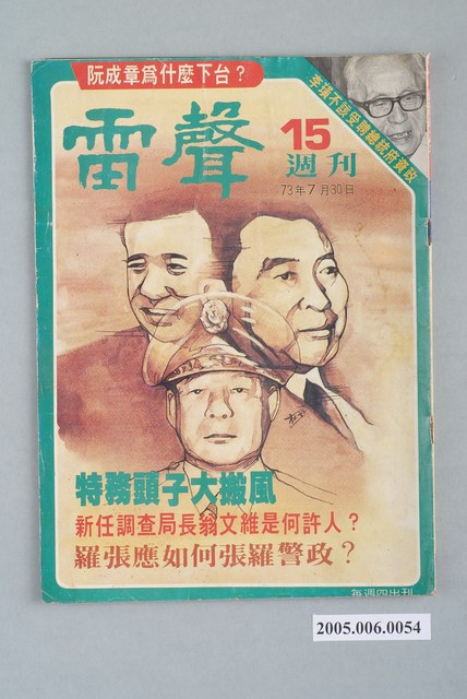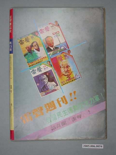 此為大學雜誌社於1984年7月出版的《雷聲》周刊第15號,內容計有〈羅張應如何張羅警政?〉(陳再道)、〈阮成章因何下台?〉(陳紀元)、〈外面一團和氣,裏面烏煙瘴氣-遷台以來國民黨內派系之消長〉(沈思)、〈關中走到了政治生命的終點?-他罩得住省黨部嗎?〉( 楊衍)、〈李璜晚節不保-當了總統府資政又能怎樣?〉(黃雲)、〈不容國民黨繼續腐化下去-黨務高層人事調整的聯想〉(雷渝齊)、〈邱連輝不怕特權!-就職縣長二年半雜感〉、〈方言是不應提倡的!-論國語與方言〉(鍾東海)、〈該花的不花,不該花的亂花-台中縣政府倒行逆施〉(羅素)、〈再見!土地-洲後村最後的速寫〉(秦桑)、〈高雄點滴〉(無名氏)等。 此件為《雷聲》雜誌,主要創辦人為雷渝齊。《雷聲》創辦人雷渝齊為政治人物,出生於重慶,後加入國民黨。在1980年當選立法委員,但試圖在1983年再次參選時因未受國民黨提名而退黨參選,在1984年創辦《雷聲》雜誌並投身黨外運動,且以老兵權益為主題,後在1987年創辦「大公黨」,並自詡為「國民兩黨外的第三勢力」。 「黨外」一詞主要為非中國國民黨的臺灣政治勢力,而「黨外」政治勢力,主要的宣傳方式為「黨外雜誌」,「黨外雜誌」最早如1950年代的《自由中國》、1970年代的《大學》、《臺灣政論》,後在1980年代「黨外雜誌」發展蓬勃,代表刊物為《八十年代》與《美麗島》,最終,這股媒體趨勢在1986年民進黨成立、1987年解除戒嚴之後逐漸式微。「黨外雜誌」在當時激起了臺灣民眾的民主意識,也逐步促成了言論自由開放。(蕭淑玲,2006,153-155)。