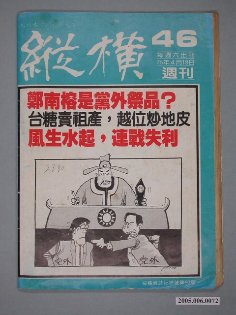 此為縱橫雜誌社1986年4月19日出版的《縱橫》週刊第46號總號93號,內容計有〈鄭南榕是黨外的祭品?-本是同根生,相煎何太急?〉(齊明思)、〈亞洲獨裁者的「菲律賓震盪」!-馬、新、印韓四國的政治迴應: 一、馬來西亞不敢「隔岸觀火」 二、新加坡記取菲國教訓 三、印尼擔心步上菲國後塵 四、韓國是否變成「菲律賓第二」?〉(王業)、〈「時報週刊」踢到「黃色」鐵板!-台南市長林文雄緋聞案的後遺症〉(關不住)、〈台糖賣祖產,越位炒地皮-又一國營事業大動胎氣的惡例〉(金可嘆)、〈朱撫松罹患「外交性無能」-陳寶忠的遲遲未歸與韓國的政治現實〉(魏慎窺)、〈風生水起,連戰失利-連戰、李達海、王玉雲的「鋼板」戰爭〉(柳寄塵)等。 此件為縱橫雜誌社出版的《縱橫》雜誌,最早於1981年由鄭臨安創刊,由宋文誠主編,為1980年代的黨外雜誌之一。《縱橫》試圖連接黨內與黨外勢力,讓國民黨能正視黨外勢力,產生兩黨競爭的利民主改革。另外在統獨立場上,《縱橫》雜誌則反對臺灣獨立,偏向統一立場。 「黨外」一詞主要為非中國國民黨的臺灣政治勢力,而「黨外」政治勢力,主要的宣傳方式為「黨外雜誌」,「黨外雜誌」最早如1950年代的《自由中國》、1970年代的《大學》、《臺灣政論》,後在1980年代「黨外雜誌」發展蓬勃,代表刊物為《八十年代》與《美麗島》,最終,這股媒體趨勢在1986年民進黨成立、1987年解除戒嚴之後逐漸式微。「黨外雜誌」在當時激起了臺灣民眾的民主意識,也逐步促成了言論自由開放。(蕭淑玲,2006,153-155)。