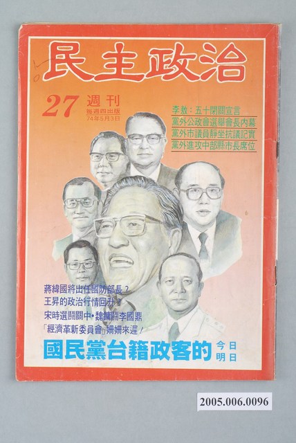 此物件為《民主政治》雜誌,為《政治家》雜誌的系列刊物,主要的創辦人為鄧維楨,相關系列刊物有《民主人》、《民主叢書》、《觀察》等。鄧維楨為《大學雜誌》的創辦人,此雜誌於1960年代末期至1970年代初為臺灣社會帶來監督政府、社會改革的風氣,而到了美麗島事件後,造成民眾對政治議題的關心,鄧維楨也隨之創辦《政治家》雜誌,但因個人問題後改為弟弟鄧維賢負責,《政治家》主要介紹黨外人物,也加以介紹黨外的活動以及評論政治時局,有時也會述說黨外內部的爭議。 「黨外」一詞主要為非中國國民黨的臺灣政治勢力,而「黨外」政治勢力,主要的宣傳方式為「黨外雜誌」,「黨外雜誌」最早如1950年代的《自由中國》、1970年代的《大學》、《臺灣政論》,後在1980年代「黨外雜誌」發展蓬勃,代表刊物為《八十年代》與《美麗島》,最終,這股媒體趨勢在1986年民進黨成立、1987年解除戒嚴之後逐漸式微。「黨外雜誌」在當時激起了臺灣民眾的民主意識,也逐步促成了言論自由開放。(蕭淑玲,2006,153-155)。