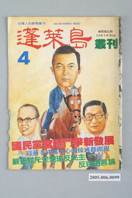 此件物件為《蓬萊島》雜誌,為1984年由黃天福、陳水扁、李逸祥等任共同創辦,以第一期的刊頭語,便表示此刊物受到《美麗島》雜誌的影響,著重在報導臺灣的黨外新聞以及以黨外立場批判臺灣政治。此刊物在第2期發表的的文章中提出時任蔣經國英文祕書馮滬祥涉嫌「以翻譯代替著作」,剽竊他人著作,因而創辦蓬萊島的三人被控告誹謗,此事件被稱為「蓬萊島案」,三人因而坐牢更賠償鉅款,但三人也因此被稱為「蓬萊島三君子」。 「黨外」一詞主要為非中國國民黨的臺灣政治勢力,而「黨外」政治勢力,主要的宣傳方式為「黨外雜誌」,「黨外雜誌」最早如1950年代的《自由中國》、1970年代的《大學》、《臺灣政論》,後在1980年代「黨外雜誌」發展蓬勃,代表刊物為《八十年代》與《美麗島》,最終,這股媒體趨勢在1986年民進黨成立、1987年解除戒嚴之後逐漸式微。「黨外雜誌」在當時激起了臺灣民眾的民主意識,也逐步促成了言論自由開放。(蕭淑玲,2006,153-155)。