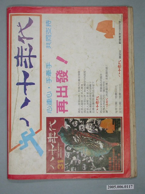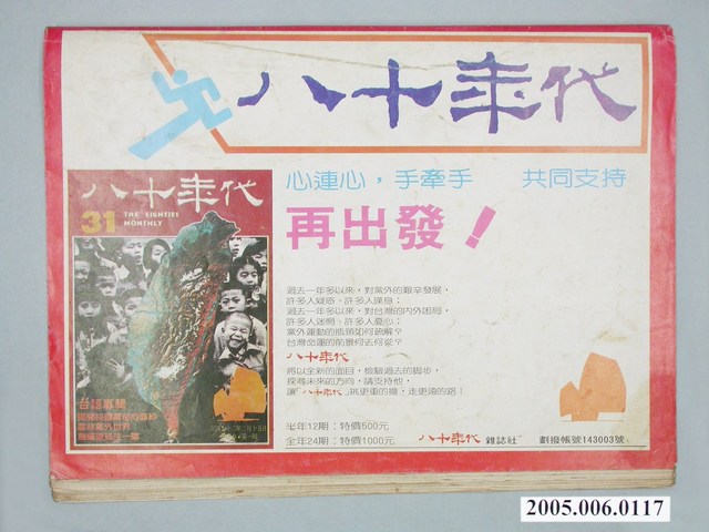 此件為康寧祥創辦的《八十年代》雜誌,為臺灣黨外雜誌的重要代表,除了編採風格較具國際觀,其相較於當時其他刊物的最大特點,在其對於「體制內改革」的倡議。《八十年代》雜誌的溫和派立場,與《美麗島》形成鮮明對比,為臺灣溫和派、議會路線的起源(蕭淑玲,2006,77-79)。 「黨外」一詞主要為非中國國民黨的臺灣政治勢力,而「黨外」政治勢力,主要的宣傳方式為「黨外雜誌」,「黨外雜誌」最早如1950年代的《自由中國》、1970年代的《大學》、《臺灣政論》,後在1980年代「黨外雜誌」發展蓬勃,代表刊物為《八十年代》與《美麗島》,最終,這股媒體趨勢在1986年民進黨成立、1987年解除戒嚴之後逐漸式微。「黨外雜誌」在當時激起了臺灣民眾的民主意識,也逐步促成了言論自由開放。(蕭淑玲,2006,153-155)。