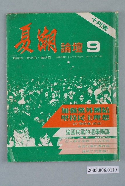 《夏潮論壇》創刊於1983年2月,是左翼評論刊物《夏潮》雜誌在1979年2月遭查禁後的復刊之作。《夏潮論壇》初期的總編為蘇慶黎,1984年後則由陳映真接手。《夏潮論壇》為當時黨外左翼雜誌之代表,是1983至1984年間「臺灣意識論戰」的主要論爭場域之一。 1976年2月《夏潮》雜誌發行,在「保釣運動」高漲的民族主義氣氛下,《夏潮》訴求鄉土認同與社會意識,漸次形成所謂「黨外左派」、「黨外統派」路線。在《夏潮》停刊後,其核心成員蘇慶黎、陳鼓應、王拓等人曾轉而投入1979年8月創刊的《美麗島》雜誌。黨外陣營之間「左右」、「統獨」之路線對立,至1980年代才日益鮮明。