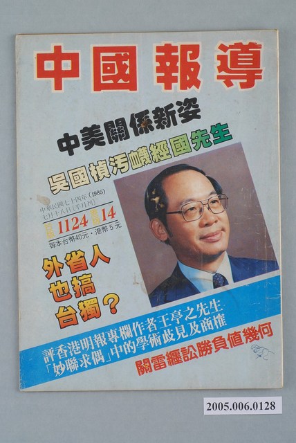 此物件為1985年7月18日出版的《中國報導》半月刊,期號為台版1124/港版14。本期內容要目計有:〈中美關係新姿〉、〈吳國楨污衊經國先生〉、〈外省人也搞臺獨?〉、〈評香港明報專欄作者王亭之先生「妙聯求偶」中的學術歧見及商榷〉、〈關雷纏訟勝負值幾何〉。 《中國報導》創刊於1973年10月28日,,發行人為鍾樹楠,其內容著重國際政治報導,並刊載國外新知短文中譯。 1970年代,中國國民黨主政的中華民國政府在外交與內政上屢遭挫敗,國民黨的統治出現鬆動,對此蔣經國採取部份改革的方式試圖拉攏民心、穩定政權,因此臺灣社會得以出現批判、建議政府的聲音。在雜誌方面首先由1970改組而成的《大學雜誌》做為開端,以及1975年接續創刊的《臺灣政論》,最後在1979年創刊的《美麗島》這一系列的雜誌,對臺灣的民主化帶來重要影響。