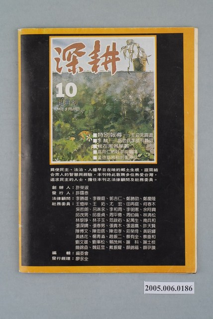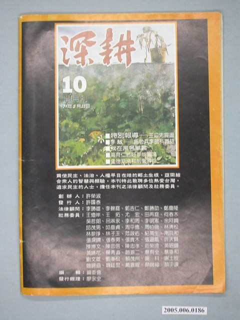 此件為《深耕》雜誌的系列刊物之一,《深耕》為1981年由黃石城創辦的黨外政論雜誌,後交由許榮淑經營,主要主筆人包含林正杰、林世煜、林濁水等,其中內容包括編輯手記、國會趨勢、選舉與黨外動向、生活與政治、鄉土人物、藝文、漫畫等等。《深耕》曾在1982年對於「杯葛事件」中的部分黨外立委進行批判,並引起當時黨外勢力的對立。 「黨外」一詞主要為非中國國民黨的臺灣政治勢力,而「黨外」政治勢力,主要的宣傳方式為「黨外雜誌」,「黨外雜誌」最早如1950年代的《自由中國》、1970年代的《大學》、《臺灣政論》,後在1980年代「黨外雜誌」發展蓬勃,代表刊物為《八十年代》與《美麗島》,最終,這股媒體趨勢在1986年民進黨成立、1987年解除戒嚴之後逐漸式微。「黨外雜誌」在當時激起了臺灣民眾的民主意識,也逐步促成了言論自由開放。(蕭淑玲,2006,153-155)。