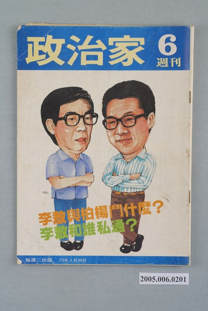 此物件為《政治家》雜誌,於1981年創辦,主要的創辦人為鄧維楨,相關系列刊物有《民主人》、《民主政治》、《民主叢書》、《觀察》等。鄧維楨為《大學雜誌》的創辦人,此雜誌於1960年代末期至1970年代初為臺灣社會帶來監督政府、社會改革的風氣,而到了美麗島事件後,造成民眾對政治議題的關心,鄧維楨也隨之創辦《政治家》雜誌,但因個人問題後改為弟弟鄧維賢負責,《政治家》主要介紹黨外人物,也加以介紹黨外的活動以及評論政治時局,有時也會述說黨外內部的爭議。 「黨外」一詞主要為非中國國民黨的臺灣政治勢力,而「黨外」政治勢力,主要的宣傳方式為「黨外雜誌」,「黨外雜誌」最早如1950年代的《自由中國》、1970年代的《大學》、《臺灣政論》,後在1980年代「黨外雜誌」發展蓬勃,代表刊物為《八十年代》與《美麗島》,最終,這股媒體趨勢在1986年民進黨成立、1987年解除戒嚴之後逐漸式微。「黨外雜誌」在當時激起了臺灣民眾的民主意識,也逐步促成了言論自由開放。(蕭淑玲,2006,153-155)。