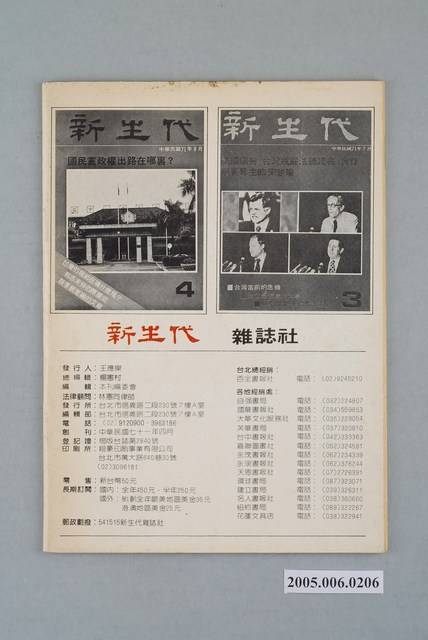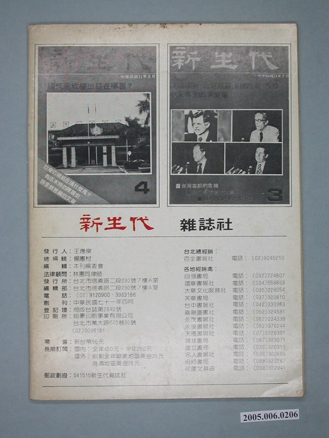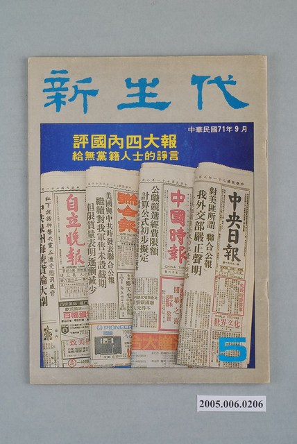 此為新生代雜誌社1982年9月出版的《新生代》雜誌第5號,內容計有〈評國內四大報〉、〈中國時報與余紀忠〉(葛酉生)、〈聯合報與王惕吾〉(牧人)、〈自立晚報今昔-「無黨無派」報紙的滄桑史〉(文娟弘)、〈李雅樵以後的自立晚報〉(趙山青)、〈中央日報的「黨中央」心態〉(魏晉辰)、〈輔園筆耕憶當年〉(茶陵)、〈聽黃天中細說從頭〉(沈寶庭)、〈中國式的轎子是圓的還是方的?-有感於「中國式民主」〉(馬高砂)、〈論「美國式民主」與「中國式民主」〉(曾祥鐸)、〈我國大眾傳播媒介自主性有多少?-兼論林洋港的「民主」〉(曾心儀)、〈深耕的「幽闇」意識〉(錢大宗)、〈給無黨籍朋友們的一些諍言-請以開放、明朗、和諧的態度從事民主建設〉(唐建國)等。 《新生代》月刊創刊於1982年4月,總編輯為汪立峽。在當時黨外雜誌的光譜中,《新生代》屬於較為保守穩健的一端,其政論立場傾向於體制內改革,提倡不分黨內外的民主運動。 「黨外」一詞主要為非中國國民黨的臺灣政治勢力,而「黨外」政治勢力,主要的宣傳方式為「黨外雜誌」,「黨外雜誌」最早如1950年代的《自由中國》、1970年代的《大學》、《臺灣政論》,後在1980年代「黨外雜誌」發展蓬勃,代表刊物為《八十年代》與《美麗島》,最終,這股媒體趨勢在1986年民進黨成立、1987年解除戒嚴之後逐漸式微。「黨外雜誌」在當時激起了臺灣民眾的民主意識,也逐步促成了言論自由開放。(蕭淑玲,2006,153-155)。
