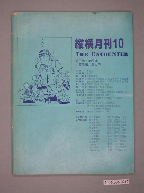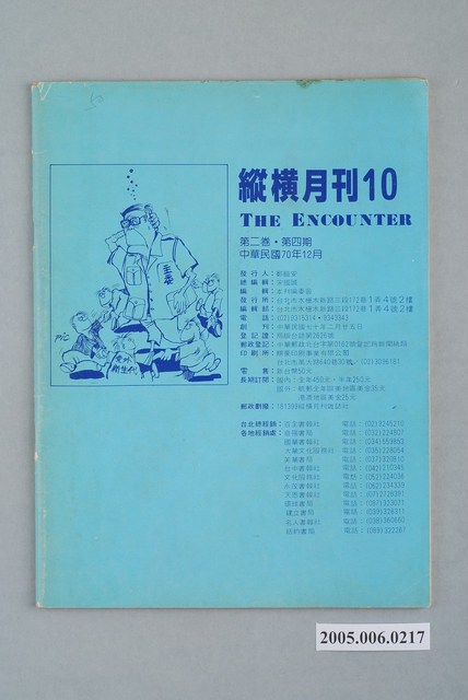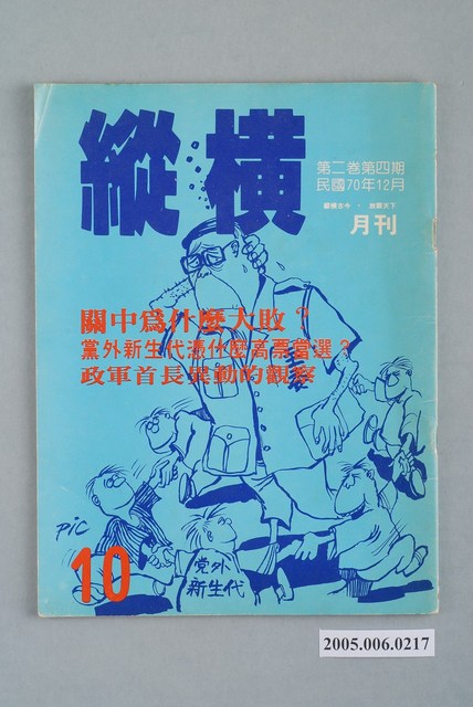 此為縱橫雜誌社1981年12月出版的《縱橫》月刊第2卷第4期第10號,內容計有〈國民黨不應縱容黨員賄選!〉、〈這是一篇「時報雜誌」登不出的文章:快棋、活棋與好棋-漫談這次政軍的人事異動〉(老叟)、〈敢以成敗論英雄-從歷屆台北市議員選舉看關中的表現〉(楊晉)、〈張秋雄不願加入黨外〉( 陳玉傑)、〈四年風水輪流轉-呂傳勝落選的因素分析〉(宋國誠)、〈余陳月瑛沒有敗!-高雄縣長選舉的透視〉(李旺台)、〈邱連輝的魅力在哪裡?-屏東縣長選戰的回顧〉(李鳴元)、〈林正杰的一小步,黨外的一大步〉(李科員)、〈又見春天裡的冷風-評金惟純「對無黨籍政治人士的作為的檢討」一文〉( 陽春盛)、〈「退報運動」要重演?〉(許明宏)、〈批評不能見容於社會嗎-有感於「書評」「書目」之停刊〉(黃忠慎)、〈為什麼人民不相信政府?〉(陳嘉宗)等。 此件為縱橫雜誌社出版的《縱橫》雜誌,最早於1981年由鄭臨安創刊,由宋文誠主編,為1980年代的黨外雜誌之一。《縱橫》試圖連接黨內與黨外勢力,讓國民黨能正視黨外勢力,產生兩黨競爭的利民主改革。另外在統獨立場上,《縱橫》雜誌則反對臺灣獨立,偏向統一立場。 「黨外」一詞主要為非中國國民黨的臺灣政治勢力,而「黨外」政治勢力,主要的宣傳方式為「黨外雜誌」,「黨外雜誌」最早如1950年代的《自由中國》、1970年代的《大學》、《臺灣政論》,後在1980年代「黨外雜誌」發展蓬勃,代表刊物為《八十年代》與《美麗島》,最終,這股媒體趨勢在1986年民進黨成立、1987年解除戒嚴之後逐漸式微。「黨外雜誌」在當時激起了臺灣民眾的民主意識,也逐步促成了言論自由開放。(蕭淑玲,2006,153-155)。