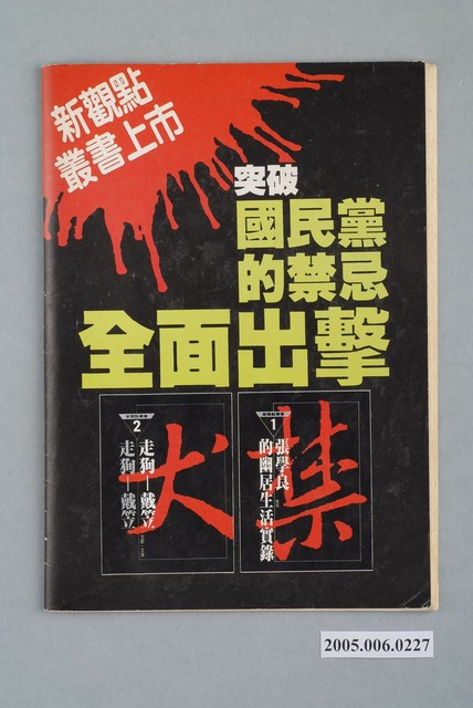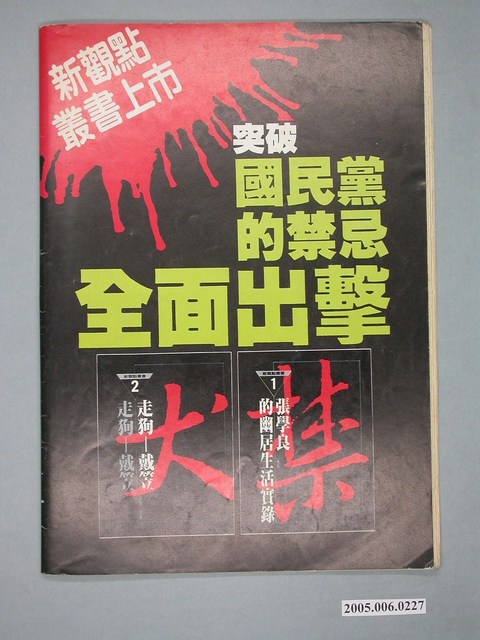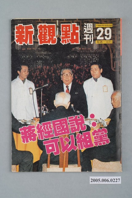 此物件為在1986年創辦的《新觀點》系列雜誌其一,創辦人為陳世傑,為批判政府的黨外雜誌其一,此雜誌目的是要興辦突破戒嚴的言論審查、貫徹言論自由,並如同該刊物的創辦語「縮頭是一刀,伸頭也是一刀」的覺悟敢論敢言。此雜誌的特色為陳水扁每期皆為其撰寫社論,而陳水扁為臺灣近代社會運動的重要人物之一,以美麗島大審的辯護律師發跡,並在「蓬萊島案」及一系列的事件中扶搖直上,並先後擔任立法委員、臺北市長及中華民國第10、11任總統。後因貪汙案導致陳水扁入獄。 「黨外」一詞主要為非中國國民黨的臺灣政治勢力,而「黨外」政治勢力,主要的宣傳方式為「黨外雜誌」,「黨外雜誌」最早如1950年代的《自由中國》、1970年代的《大學》、《臺灣政論》,後在1980年代「黨外雜誌」發展蓬勃,代表刊物為《八十年代》與《美麗島》,最終,這股媒體趨勢在1986年民進黨成立、1987年解除戒嚴之後逐漸式微。「黨外雜誌」在當時激起了臺灣民眾的民主意識,也逐步促成了言論自由開放。(蕭淑玲,2006,153-155)。