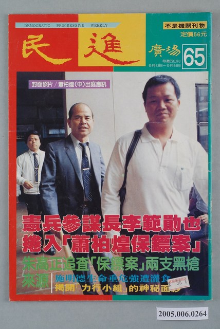 《民進周刊》於1987年2月19日創刊,創辦人為吳祥輝。此刊物曾陸續以《民進時代》、《民進廣場》、《民進天地》、《民進世界》等名稱出版,最終在1980年8月20日停刊。由刊物封面標語「不是機關報」、「人民第一、民進黨第二」可知,《民進周刊》雖然在政治立場與民進黨親近,但是並非隨附性的刊物。 「黨外」一詞主要為非中國國民黨的臺灣政治勢力,而「黨外」政治勢力,主要的宣傳方式為「黨外雜誌」,「黨外雜誌」最早如1950年代的《自由中國》、1970年代的《大學》、《臺灣政論》,後在1980年代「黨外雜誌」發展蓬勃,代表刊物為《八十年代》與《美麗島》,最終,這股媒體趨勢在1986年民進黨成立、1987年解除戒嚴之後逐漸式微。「黨外雜誌」在當時激起了臺灣民眾的民主意識,也逐步促成了言論自由開放。(蕭淑玲,2006,153-155)。 "