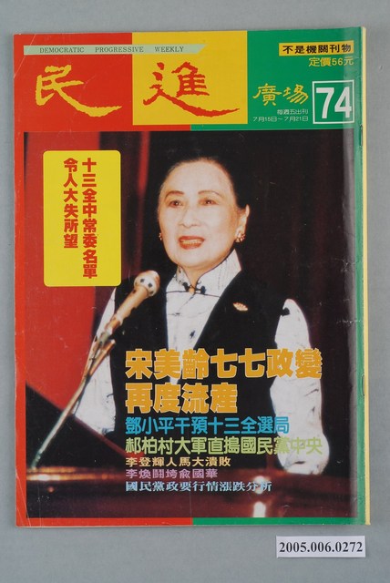 《民進周刊》於1987年2月19日創刊,創辦人為吳祥輝。此刊物曾陸續以《民進時代》、《民進廣場》、《民進天地》、《民進世界》等名稱出版,最終在1980年8月20日停刊。由刊物封面標語「不是機關報」、「人民第一、民進黨第二」可知,《民進周刊》雖然在政治立場與民進黨親近,但是並非隨附性的刊物。 「黨外」一詞主要為非中國國民黨的臺灣政治勢力,而「黨外」政治勢力,主要的宣傳方式為「黨外雜誌」,「黨外雜誌」最早如1950年代的《自由中國》、1970年代的《大學》、《臺灣政論》,後在1980年代「黨外雜誌」發展蓬勃,代表刊物為《八十年代》與《美麗島》,最終,這股媒體趨勢在1986年民進黨成立、1987年解除戒嚴之後逐漸式微。「黨外雜誌」在當時激起了臺灣民眾的民主意識,也逐步促成了言論自由開放。(蕭淑玲,2006,153-155)。 "