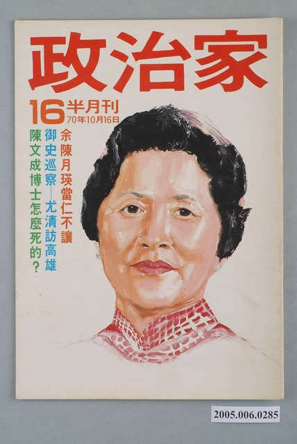 此物件為《政治家》雜誌,於1981年創辦,主要的創辦人為鄧維楨,相關系列刊物有《民主人》、《民主政治》、《民主叢書》、《觀察》等。鄧維楨為《大學雜誌》的創辦人,此雜誌於1960年代末期至1970年代初為臺灣社會帶來監督政府、社會改革的風氣,而到了美麗島事件後,造成民眾對政治議題的關心,鄧維楨也隨之創辦《政治家》雜誌,但因個人問題後改為弟弟鄧維賢負責,《政治家》主要介紹黨外人物,也加以介紹黨外的活動以及評論政治時局,有時也會述說黨外勢力的互相爭執。 「黨外」一詞主要為非中國國民黨的臺灣政治勢力,而「黨外」政治勢力,主要的宣傳方式為「黨外雜誌」,「黨外雜誌」最早如1950年代的《自由中國》、1970年代的《大學》、《臺灣政論》,後在1980年代「黨外雜誌」發展蓬勃,代表刊物為《八十年代》與《美麗島》,最終,這股媒體趨勢在1986年民進黨成立、1987年解除戒嚴之後逐漸式微。「黨外雜誌」在當時激起了臺灣民眾的民主意識,也逐步促成了言論自由開放。(蕭淑玲,2006,153-155)。