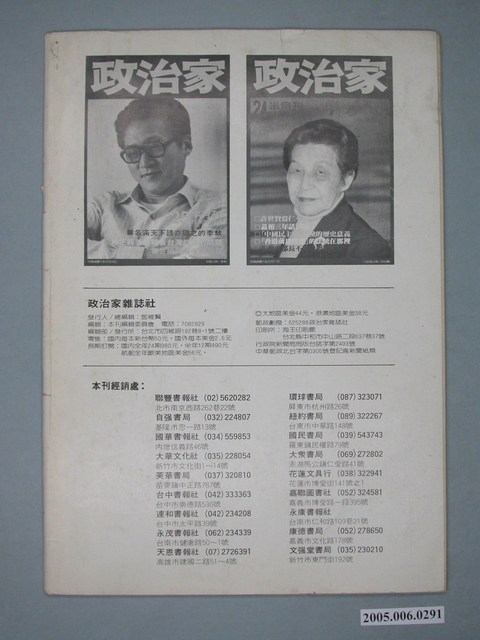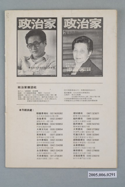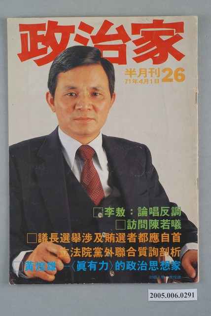 此物件為《政治家》雜誌,於1981年創辦,主要的創辦人為鄧維楨,相關系列刊物有《民主人》、《民主政治》、《民主叢書》、《觀察》等。鄧維楨為《大學雜誌》的創辦人,此雜誌於1960年代末期至1970年代初為臺灣社會帶來監督政府、社會改革的風氣,而到了美麗島事件後,造成民眾對政治議題的關心,鄧維楨也隨之創辦《政治家》雜誌,但因個人問題後改為弟弟鄧維賢負責,《政治家》主要介紹黨外人物,也加以介紹黨外的活動以及評論政治時局,有時也會述說黨外勢力的互相爭執。 「黨外」一詞主要為非中國國民黨的臺灣政治勢力,而「黨外」政治勢力,主要的宣傳方式為「黨外雜誌」,「黨外雜誌」最早如1950年代的《自由中國》、1970年代的《大學》、《臺灣政論》,後在1980年代「黨外雜誌」發展蓬勃,代表刊物為《八十年代》與《美麗島》,最終,這股媒體趨勢在1986年民進黨成立、1987年解除戒嚴之後逐漸式微。「黨外雜誌」在當時激起了臺灣民眾的民主意識,也逐步促成了言論自由開放。(蕭淑玲,2006,153-155)。