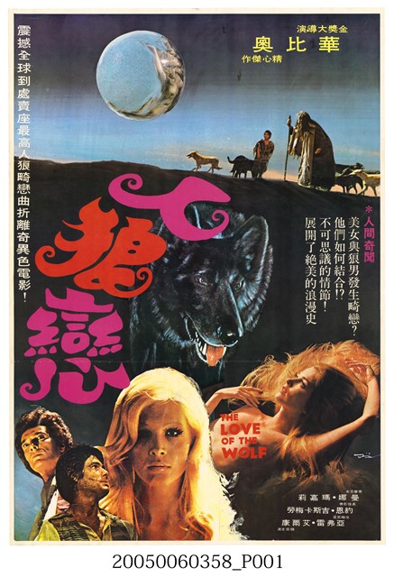 1.阿根廷片《人狼戀》上映時的中文彩色海報,直式印刷。畫面主要呈現一匹黑狼張嘴望向前方的頭部特寫畫像,配上金髮赤裸女子躺在地上與三名角色的半身人像。搭配「金獎大導演 華比奧 精心傑作」、「震撼全球到處賣座最高人狼畸戀曲折奇異色電影!」等文案字樣。海報上有陳子福的簽名,但海報主要為劇照剪貼。猜測應該是本片片名「人狼戀」三個藝術字由陳子福所做。海報有一折折痕。2.《人狼戀》(又名《人狼之戀》;Nazareno Cruz y el lobo)是1975年阿根廷的奇幻恐怖電影,由Choila Producciones Cinematográficas出品,International DVD Group發行,華比奧(Leonardo Favio)執導,Juan Carlos Chiappe、Leonardo Favio、Jorge Zuhair Jury編劇,約恩吉斯卡梅勞(Juan José Camero)、曼娜瑪嘉莉(Marina Magali)、亞弗雷艾爾康(Alfredo Alcón)主演的劇情片。