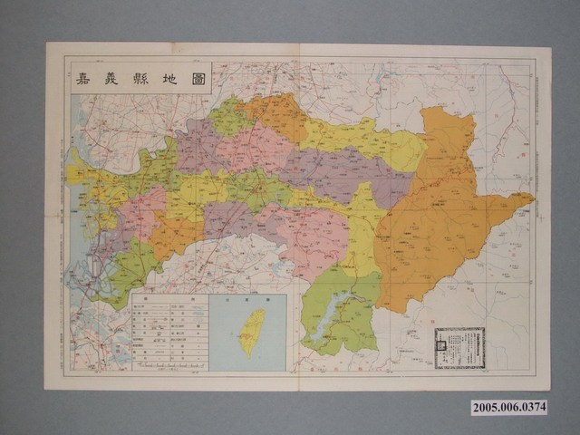 本件包含2幅地圖,正面為〈嘉義縣地圖〉,比例尺十萬分之一,背面為〈嘉義市街道圖〉,比例尺六千分之一,金蘋企業有限公司製作,1981年發行。