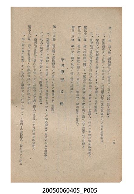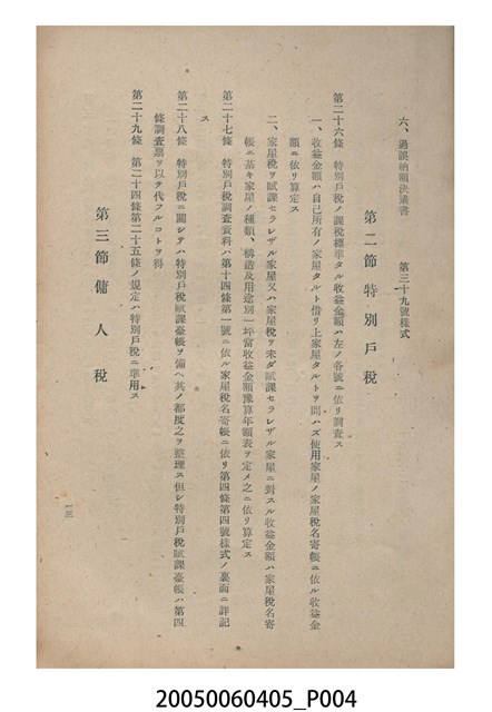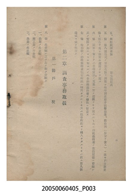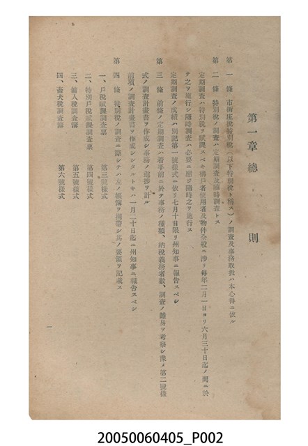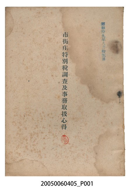 本物件為《市街庄特別稅調查及事務取扱心得》,為紙質,呈方形,為書籍,封面有「昭和拾九年八月拾五日」藍色蓋印與紅色橢圓蓋印及「市街庄特別稅調查及事務取扱心得」黑色字樣,其內容分為總則、調查事務取2章,第2章下又分為6節,物件已有些斑駁泛黃。