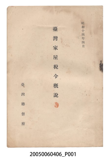 本物件為臺灣總督府發行《臺灣家屋稅令概說》,為紙質,呈方形,為書籍,封面有紅色橢圓蓋印及「昭和十四年四月」、「臺灣家屋稅令概說」、「臺灣總督府」黑色字樣,封底無圖案字樣,其內容分為臺灣家屋稅令ノ實施ニ當リテ及臺灣家屋稅令概說2部分,第2部份內又分為13部份,共20頁,物件已有些斑駁泛黃。