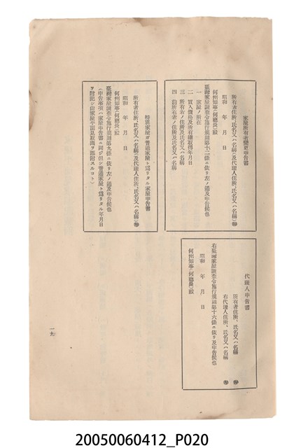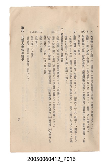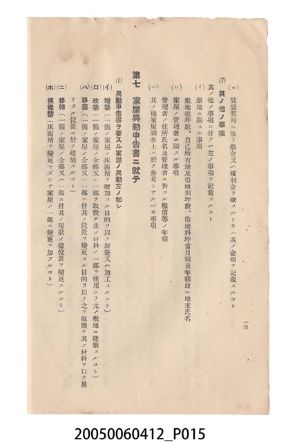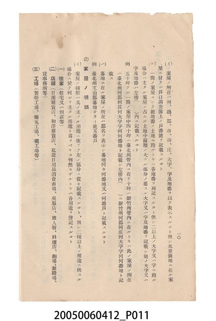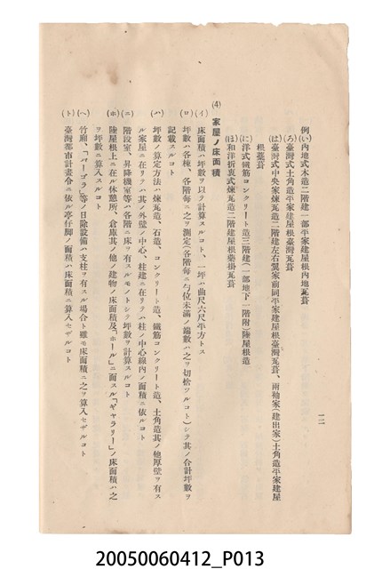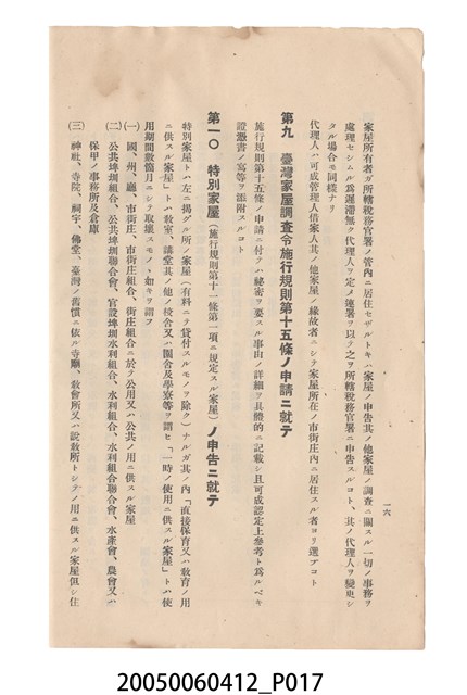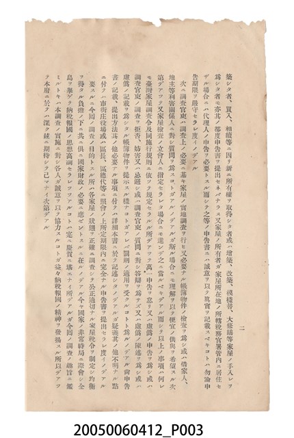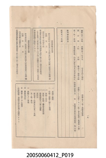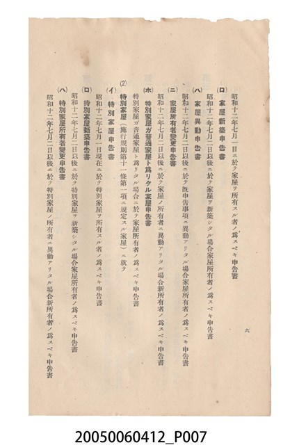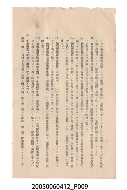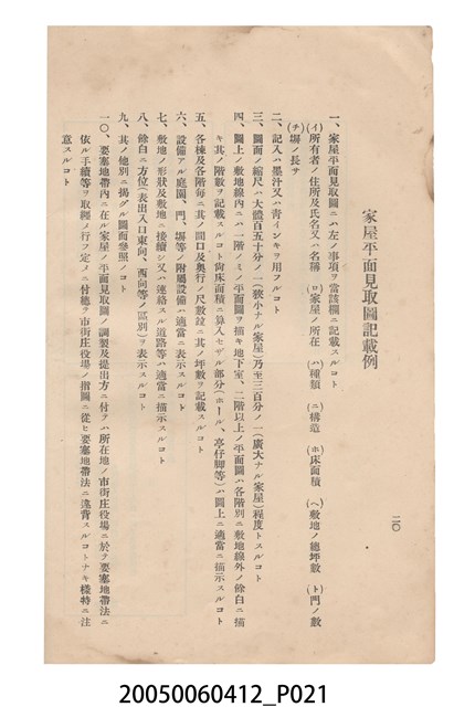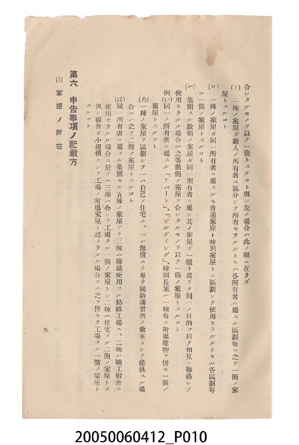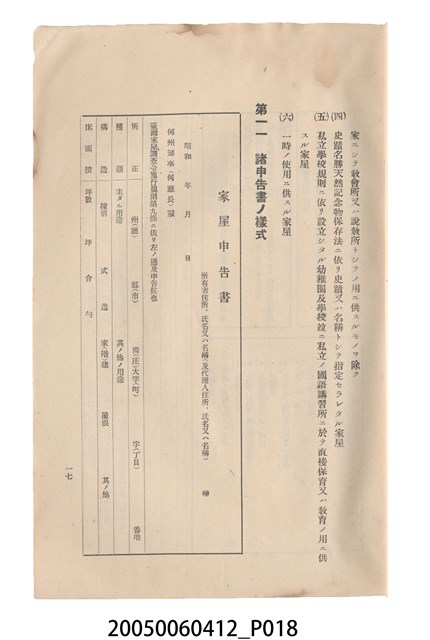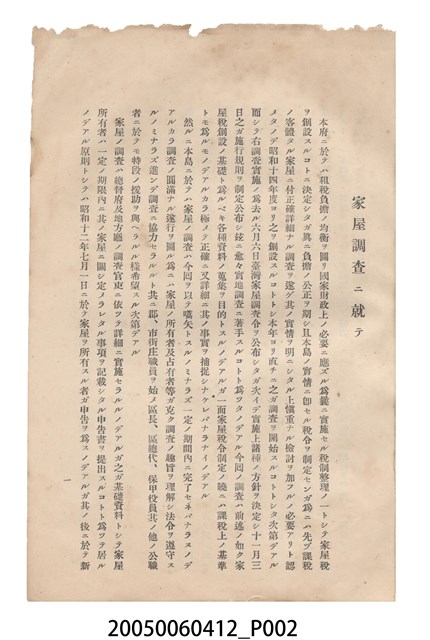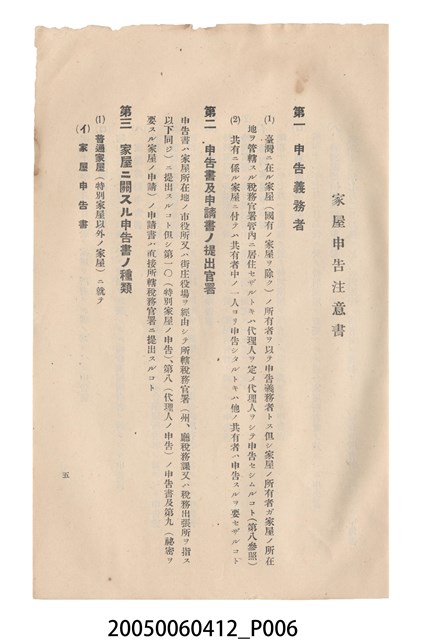 本物件為臺灣總督府發行《家屋申告注意書》,為紙質,呈方形,為書籍,封面有紅色橢圓蓋印及「家屋申告注意書」、「臺灣總督府」黑色字樣,封底無圖案字樣,其內容分為家屋調查ニ就テ、臺灣家屋調查令ニ關スル概說、家屋申告注意書、家屋平面見取圖記載例共4個部份,共20頁,物件已有些斑駁汙損。