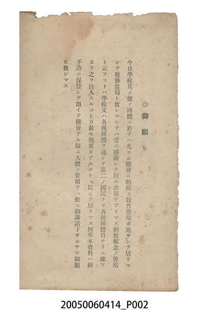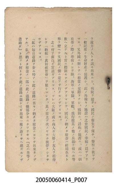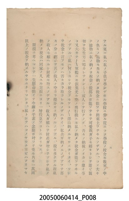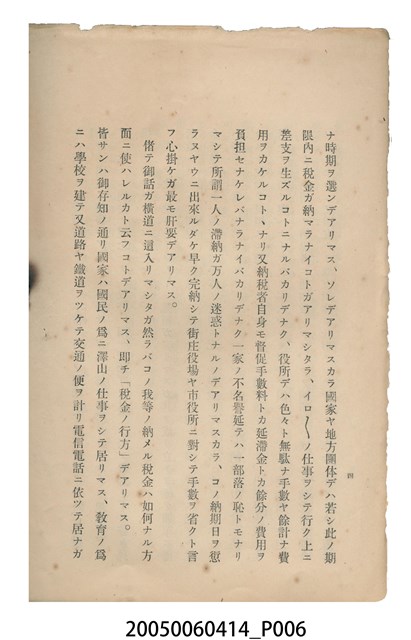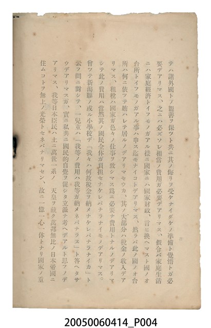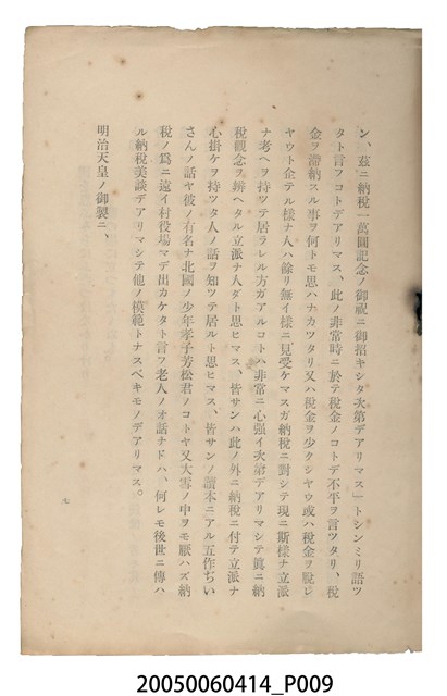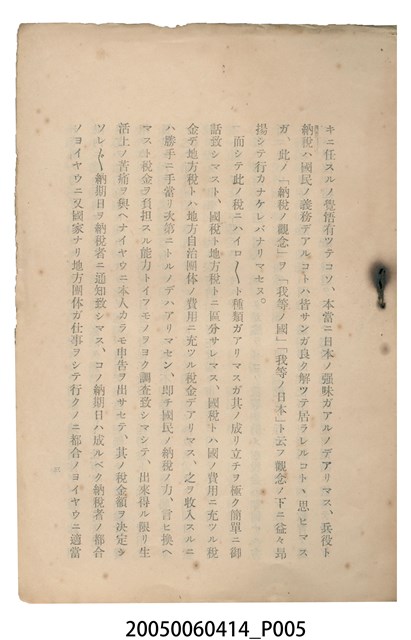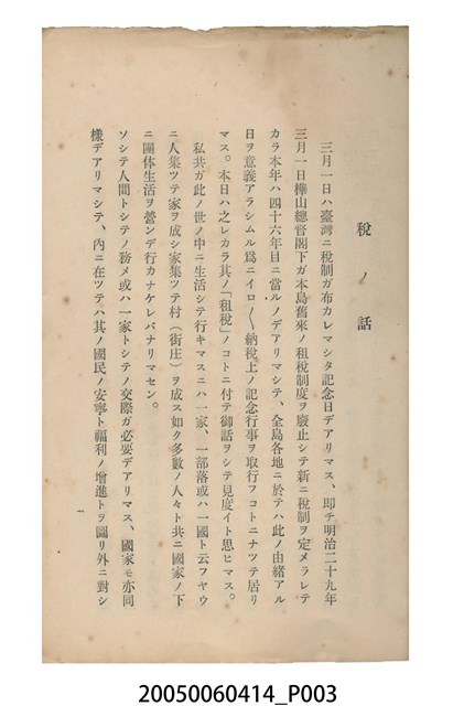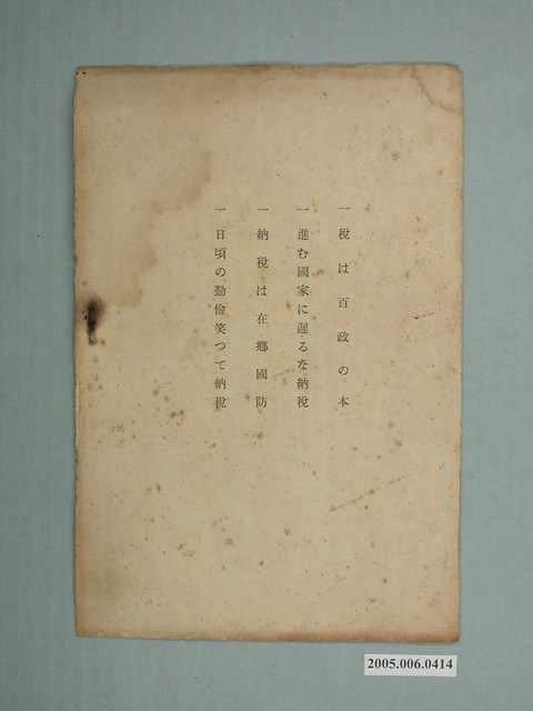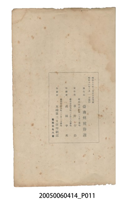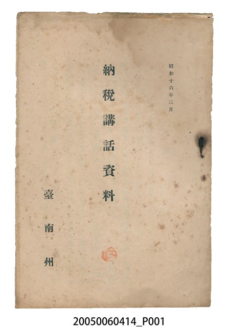 本物件為臺南州發行《納稅講話資料》,為紙質,呈方形,為書籍,封面有紅色橢圓蓋印及「昭和十六年三月」、「納稅講話資料」、「臺南州」黑色字樣,封底有「一稅は百政の本」、「一進む國家に遲るな納稅」、「一納稅は在鄉國防」、「一日頃の勤儉笑つて納稅」黑色字樣,其內容為講解納稅的功用、義務及重要性,共8頁,發行所為臺南州稅務課,印刷所為五端第三支店印刷部。