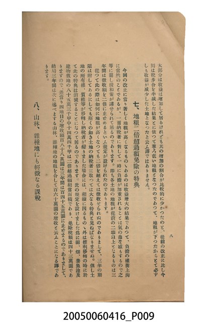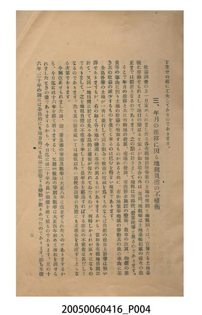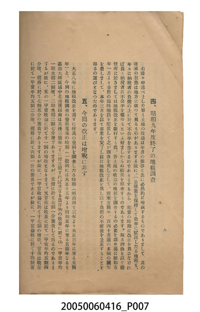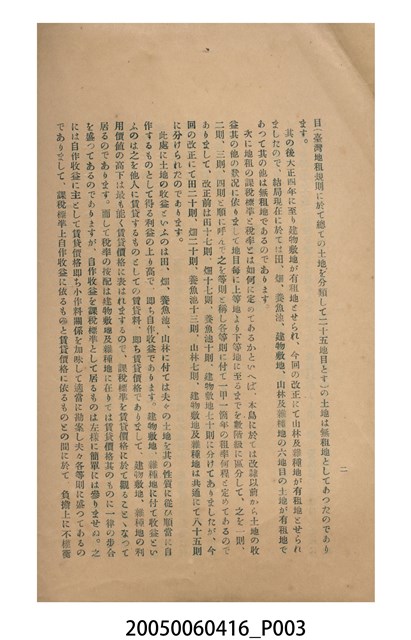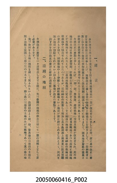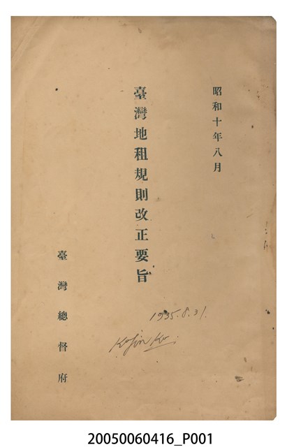 本物件為臺灣總督府《臺灣地租規則改正要旨》,為紙質,呈方形,為書籍,封面有「昭和十年八月」、「臺灣地租規則改正要旨」、「臺灣總督府」、「1935.8.31.」黑色字樣,及一列書寫體英文字,封底無圖案字樣,其內容分為「緒言」、「臺灣の地租」、「年月の推移に因る地租負擔の不權衡」、「昭和九年度終了の地租調查」、「今囘の改正は增稅に非ず」、「田、畑、養魚池、建物敷地八十五萬甲中十九萬甲は減稅」、「地租二倍超過額免除特典」、「山林、雜種地にも輕微なる課稅」、「改正等則及租率」、「地租附加稅及地租割」共10部份,共10頁。