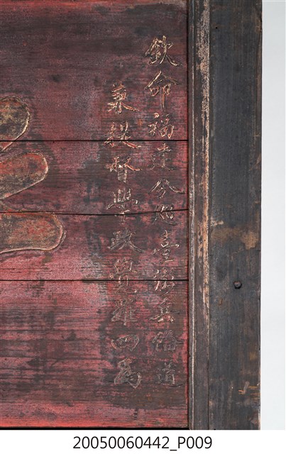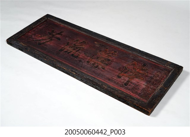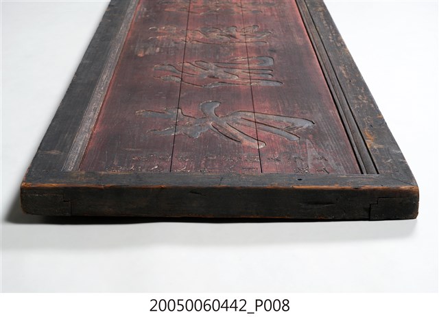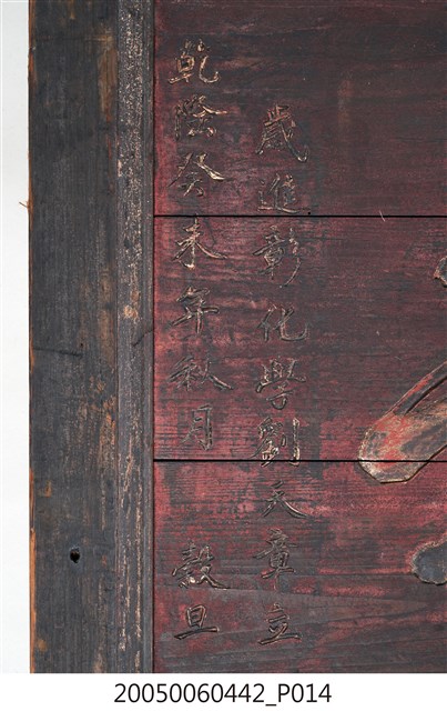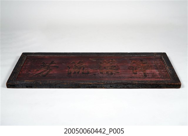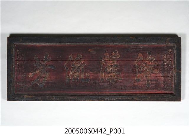 1.本藏品為木製匾額一方,上款「欽命福建分尋臺澎兵俻道兼提督學政覺羅四爲」,中間為四大字匾詞「泮藻流芳」,下款為「歲進彰化學劉天章立 乾隆癸未年秋月 穀旦」,依其紀年可知此匾是乾隆28年(1763)所立。上款「欽命福建分尋臺澎兵俻道兼提督學政覺羅四爲」,係指清代官員學羅四明(1716-1777),乾隆26年(1761)任福建分巡臺灣道。