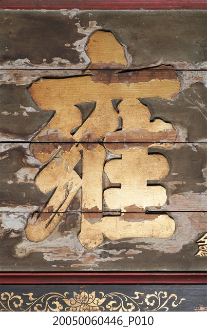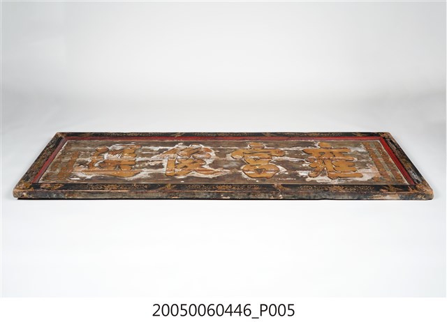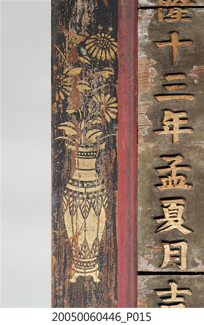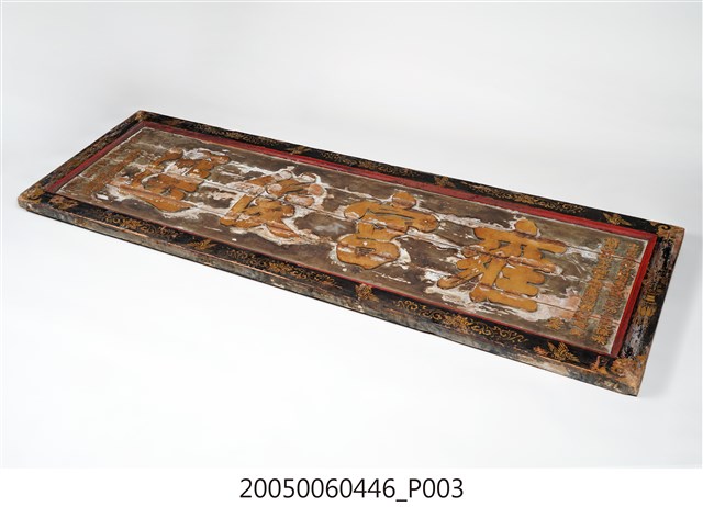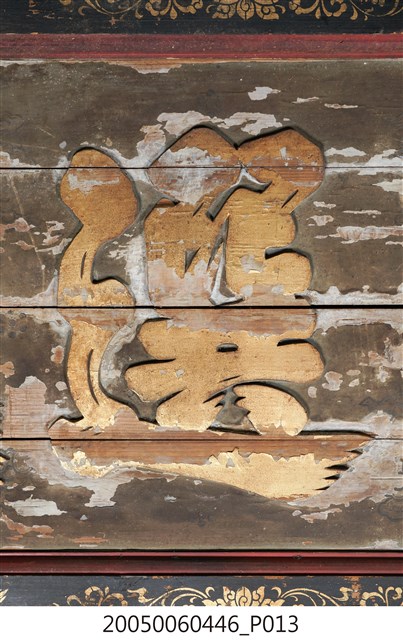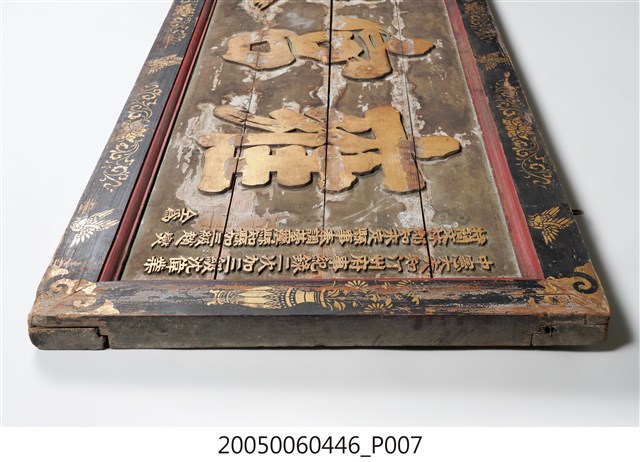 3.此匾主體係由4塊長形木頭拼接而成,四邊做邊框,背面有4條垂直木條固定,邊框以黑地描金彩繪做,上下邊框以唐草蓮花及飛禽為主題,左右則以瓶花為彩繪主角。