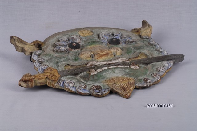 本件八卦劍獅牌以木雕彩繪方式製作,以獅頭鬃毛為外形,獅頭以綠色為主色,與臺灣中部地區常見的閉口獅(雞籠獅)類似,綠色即為常見的辟邪顏色,整面有褪色情形。獅頭雙眼圓睜,眉毛與鬃毛作捲曲狀,作石青色,額頭正中央置一方小型八卦,耳朵與鼻頭、下鬚為金黃色,呲牙咧嘴而口啣一把劍柄朝左的七星劍。