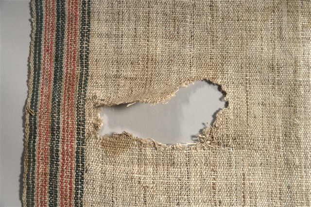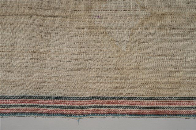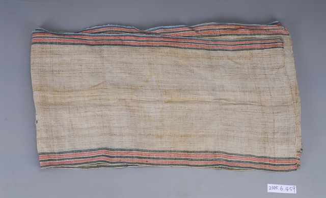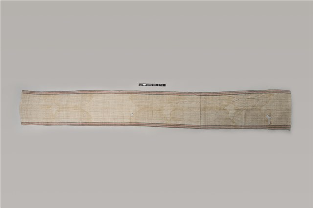1.本件織布外形呈現長方形,長406公分,寬60公分,採白色、黑色、紅色、藍色織線為經線,白色苧麻線為緯線,以平紋織法織作而成,形成長邊兩側帶有直線紋路的織布,其織紋為紅、黑各兩道交替,最外側一邊為黑色織紋,另一側則以天藍色織紋代替,織布兩側短邊均未作收邊處理。2.織布主要用於縫製男女服飾,如上衣、披肩、裙子、胸兜與護腳布等穿著服飾,或做為被單或睡毯等寢具之用。泰雅族女子自小即開始學習織布,在泰雅族的傳統社會中,男性以狩獵技巧,女性以織布技術獲得社會地位。在未婚女子中,專精織布是男性挑選妻子的條件之一。