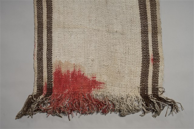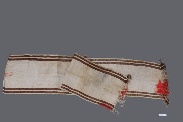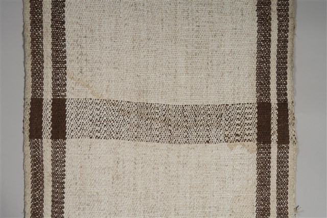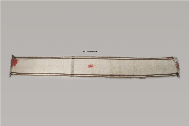1.本件織布外形呈現長方形,長466.4公分,寬61公分,採白色與咖啡色苧麻線為經線,白色苧麻線為緯線,以平紋織法織作而成,形成長邊兩側各帶有2道咖啡色帶狀織紋,咖啡色苧麻線是以薯榔做為染材,以直接染色的方式染成。織布兩側短邊均未進行收邊處理形成流蘇狀。2.本件織布由布料與染色狀況顯示,應為1945年之後所製作。織布在各臺灣原住民社會中都是女性專屬的工作,舉凡與織布相關的知識與工具皆有一定的規範。泰雅族的傳統織布多以苧麻纖維做為材料,從取纖製線到完成織布需經過一系列相當繁複的程序,包括採麻、刮麻、析麻、