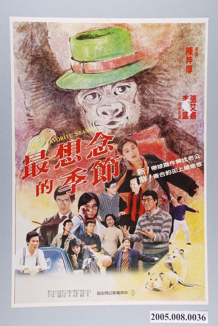 1.臺灣電影《最想念的季節》上映時的中文彩色海報,直式印刷。畫面主要呈現猩猩戴著綠色帽的特寫畫像,和鸚鵡、小老鼠的素描插畫,海報中間處拼貼角色們的人像。搭配「英文片名:My Favorite Season」、「新!帶球跑作風找老公 鮮!簽合約卯上綠爸爸」。海報有四折折痕;演員「李宗盛」處有破損;右下角蓋有橢圓章。2.本片是1985年由中央電影事業股份有限公司出品,中央電影事業股份有限公司發行,陳坤厚執導,朱天文、丁亞民、侯孝賢、許淑真編劇,張艾嘉、李宗盛、管管主演改編至朱天文同名小說的文藝劇情片。