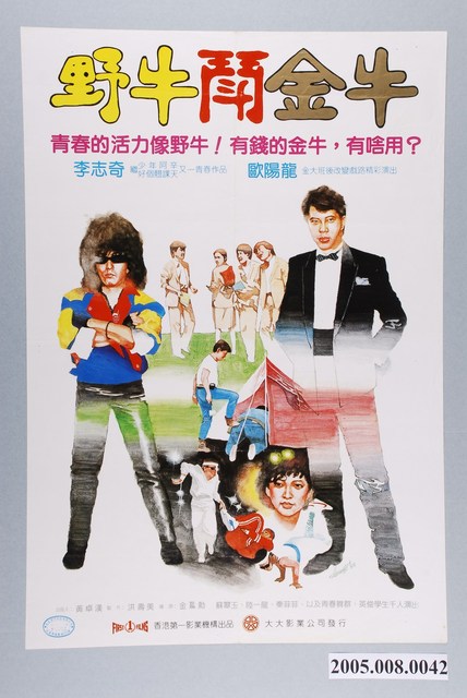 1.臺灣電影《野牛鬥金牛》上映時的中文彩色海報,直式印刷。畫面主要呈現兩個角色的全身特寫畫像:穿西裝的歐陽龍,和留長髮、戴墨鏡的李志奇,配上校園學生們聚集聊天跳舞的畫像場景。搭配「李志奇 繼少年阿辛 好個翹課天 又一青春作品」、「歐陽龍 金大班後改變戲路精彩演出」等文案字樣。海報有三折折痕;左下角蓋有藍色橢圓章。2.本片是1984年由香港第一影業機構出品,大大影業公司發行,金鰲勳執導,賴漢初編劇,李志奇、歐陽龍、蘇翠玉主演的劇情片。