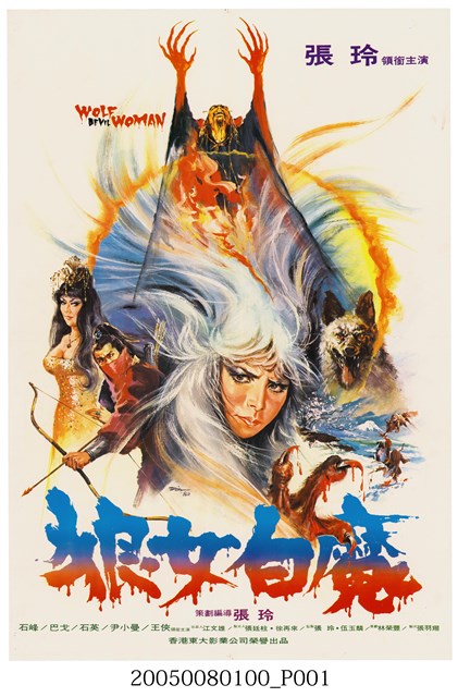 1.手繪海報大師陳子福之作,臺灣電影《狼女白魔》上映時的中文彩色海報,直式印刷。畫面主要呈現白髮女子頭髮飛舞,眼神銳利直視前方的半身特寫畫像,配上身穿黑色長袍的男子舉高魔爪般的雙手,面仰天,周身有一圈火光的模樣。搭配「英文片名:WOLF DEVIL WOMAN」等文案字樣。海報有一折折痕。2.本片是1982年由香港東大影業公司出品,張玲執導,張玲編劇,張玲、石峰、王俠主演的奇幻武俠片。