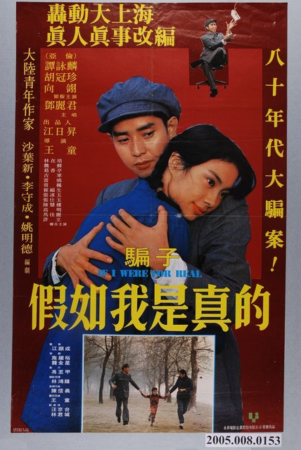1.臺灣電影《假如我是真的》上映時的中文彩色海報,直式印刷。畫面主要呈現譚詠麟與胡冠珍抱在一起的半身特寫人像,以及兩人牽著一名小孩,開心跑跳的劇照。搭配「轟動大上海真人真事改編」、「八十年代大騙案」、「英文片名:IF I WERE FOR REAL」等文案字樣。海報有五折折痕。2.本片是1981年由永昇影業有限公司出品,王童執導,沙葉新、李守成、姚明德、張永祥編劇,譚詠麟、胡冠珍、向翎主演的劇情片。本片獲得1981年第18屆金馬獎最佳劇情片獎、最佳改編劇本獎(張永祥)、最佳男主角獎(譚詠麟)。