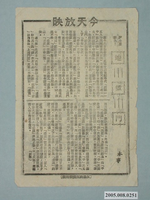 電影廣告單《荒漠餘生》單張直幅黑色雙面印刷,外觀保存良好。電影由 Audie Murphy、 Lori Nelson、Chill Wills 主演,導演Nathan Juran,1953年上映。仙宮戲院上映。下方印有「東和印務公司承印」字樣。背面為電影《地獄門》Jigokumon / Gate of Hell。電影由 長谷川一夫、京町子、山形勳主演,導演衣笠貞之助,1953年上映。下方印有「反暴政反殘殺而戰」字樣。