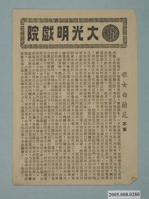 本物件為大光明戲院宣傳單,紙質文物。該宣傳單正面上方可見「下期放映 是一部家庭倫理兒童教育感人巨片」字樣,上方為「小燕流浪記」之主演名單;下方為「女賊」主演名單及工作團隊介紹。背面上方可見「大光明戲院」字樣,主要為「歌女白蘭花」劇情介紹。因全臺「大光明戲院」至少有兩間,其一位於嘉義、另一間位於臺北市,此藏品無法明確辨識所屬地區,故未能確認其歷史背景。
