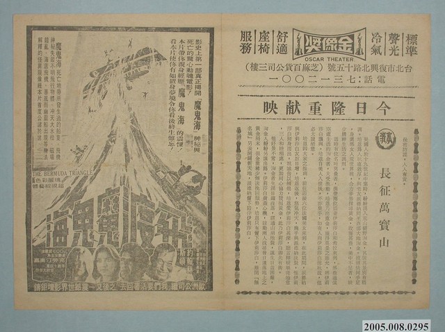 本件保存情況良好,為雙面印刷。播放的戲院為金像獎戲院。其餘部分為電影長征萬寶山。事情發生在著名的百慕達大三角附近,有一天加勒比海上的夏季遊船的乘客和船員突然消失,一連串神秘的事情就此開始發生。由約翰.休斯頓(John Huston) 、安德烈.賈西亞(Andrés García) 主演。