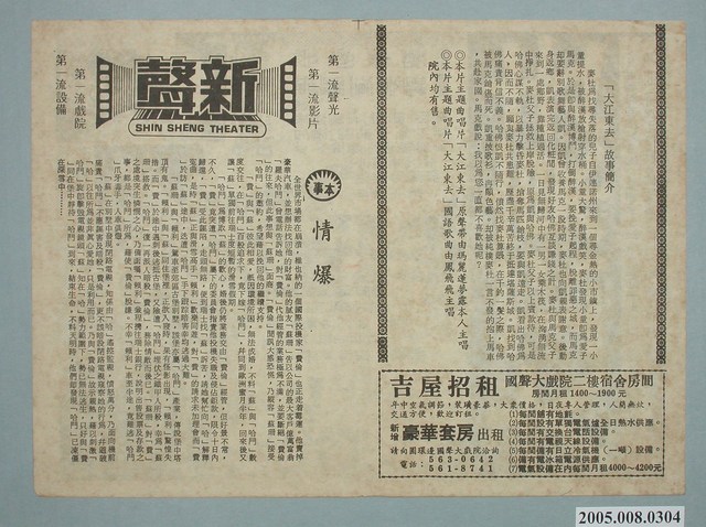 本件保存情況良好,為雙面印刷。播放的戲院為新聲戲院。其餘部分為電影情爆。一個出獄的牛仔麥特(Matt)騎著馬穿過森林,要到鎮上尋找他的兒子馬克(Mark),發現馬克被歌女凱伊(Kay)收留,找到兒子之後父子倆決定開始新生活,結果在河上意外的救了乘坐木筏前往隔壁鎮的凱伊和她的賭徒哈利(Harry),哈利得到了金礦的開採權所以迫不及待的帶著凱伊走水路,誰知木筏不穩即將翻覆,幸好得到麥特的幫助,但是哈利不僅沒有感謝還打傷了麥特想搶他的馬和槍,生氣的凱伊決定留下來照顧父子倆而哈利則獨自前往。在三人前去鎮上的途中,