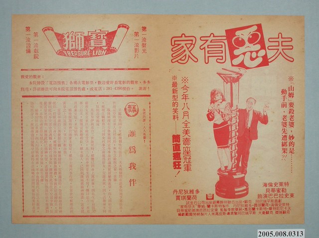 本件保存情況良好,為雙面印刷。播放的戲院為寶獅戲院。其餘部分為電影家有惡夫、誰為我伴。本片故事改編自日本小說南總里見八犬傳。一百年前,里見家將蠆田家消滅掉時,蠆田玉梓曾留下一句恐怖的毒誓,詛咒百年後必將會血洗里見一家。另一方面,伏姬公主捨身幻化八顆靈珠,並預言在百年後持珠的眾八犬士將會幫助公主平妖,戰勝魔咒。一百年後,重生的玉梓派人追殺里見家的人,歷經一場慘烈戰鬥後,只剩里見家的公主靜姬殘存。倖存的靜姬只能依靠八位犬士身上『仁、忠、義、禮、孝、信、智、悌』八個靈珠,來尋找八犬士復仇。靜姬在不得以的情況下女