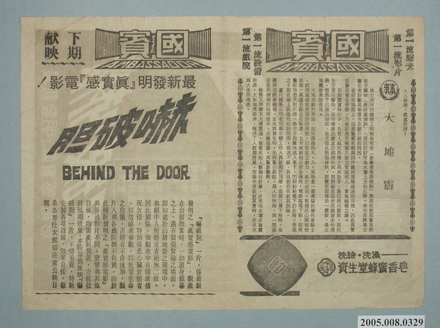 本件保存情況良好,為雙面印刷。播放的戲院為國賓戲院。其餘部分為電影大地震。一名孕婦即將要生下一名惡魔的孩子,正當他們苦惱的時候,這時一名陌生的男子前來幫助這對夫妻,究竟這名男子想要的到底是甚麼?由朱麗葉・米爾斯(Juliet Mills)、蓋布瑞爾・拉維亞(Gabriele Lavia)、理查・強森(Richard Johnson)主演。
