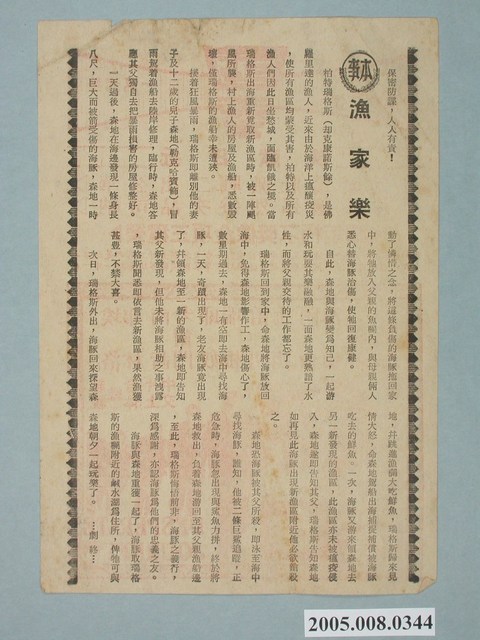 本件保存情況良好,為雙面印刷。播放的戲院為國泰戲院。其餘部分為電影漁家樂。當一組被擊落的英國轟炸機的機組人員獲取了納粹的最高機密時,他必須帶著情報跟其他的納粹俘虜一起逃亡,躲避納粹的追趕逃離德國國境。由艾羅爾.弗林(Errol Flynn)、隆納.雷根(Ronald Reagan)、南茜.蔻曼(Nancy Coleman)、雷蒙.梅西(Raymond Massey)、艾倫.海爾(Alan Hale)主演。